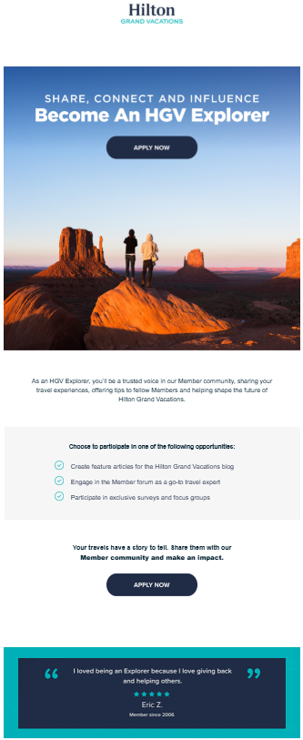 Originally launched in 2018 to spotlight real member stories on HGV’s blog and amplify the member voice, the Explorer program has tripled in size and evolved into a vibrant influencer community under my leadership.